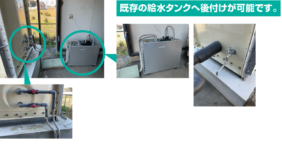 給水タンクと加圧ポンプの間に後付けで装置を設置することにより、「ナチュラルナノバブル水」を使用した洗濯が可能になります。
