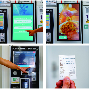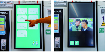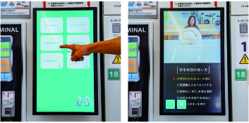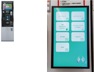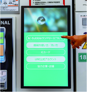 店内に設置したデジタルサイネージを使用してランドリー機器の使い方の紹介動画やコンセプト動画、近隣企業のクーポン発券までおこなっています。
