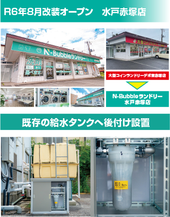 給水タンクと加圧ポンプの間に後付けで装置を設置することにより、「ナチュラルナノバブル水」を使用した洗濯が可能になります。